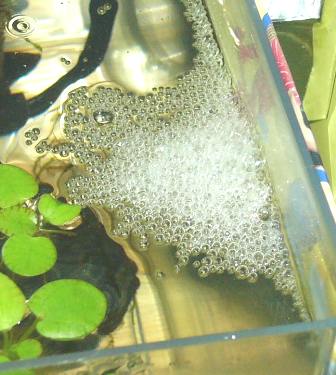 彼等が2匹でそこそこにうまく抱き合えるようになってから30分ほどして、水槽の脇から後へ回り、そぉ~っと泡巣の卵を探してみた。う~ん、幾ら探しても見当たらない。こんもり層が厚くなってるとこにくっつけてるのかなぁ? 食べているとすればキンニク1匹だろうし、おなかもこんもりするはず?