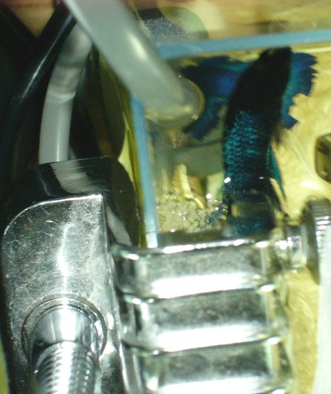 お昼頃にはメスがオスをうかがっていて、近づいては突かれ、近づいては突かれを繰返したため水流を止め、蓋を外しておいた。蓋を外しておいたのは、産卵終了後にメスを取り出す際、不手際とならないように工夫してみただけのこと。